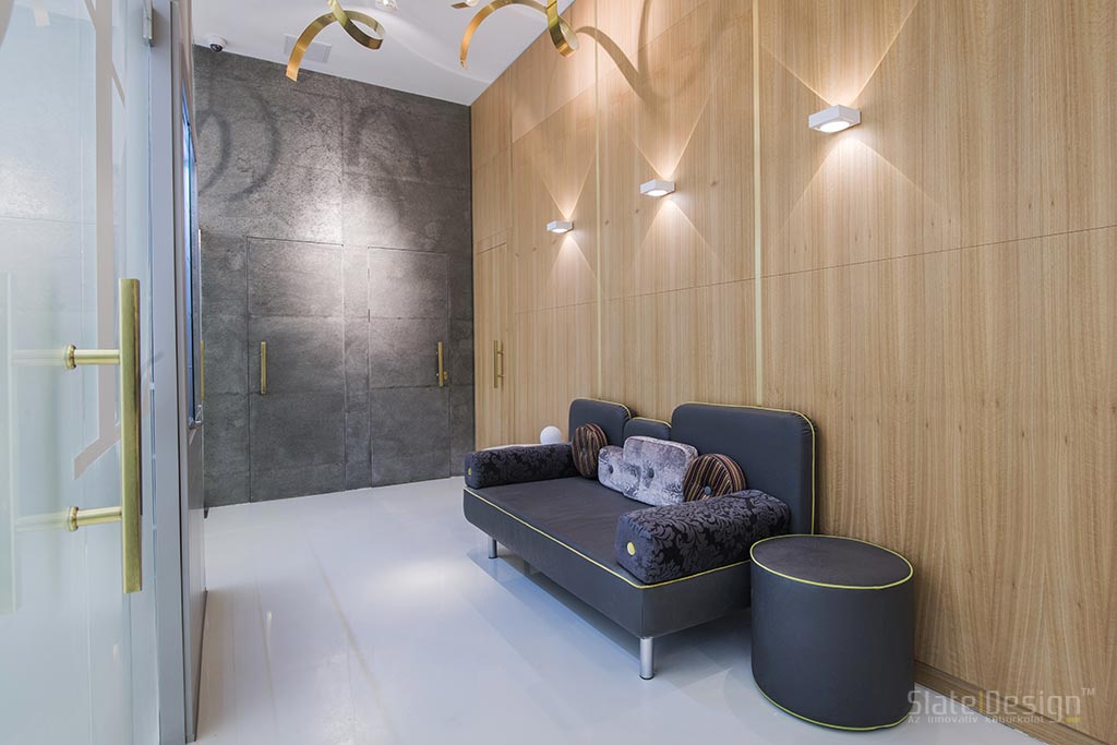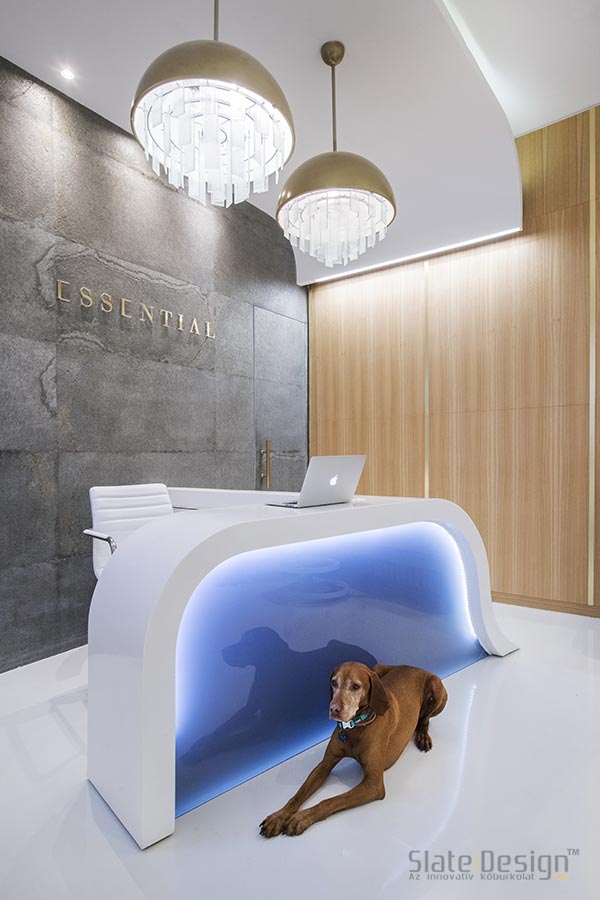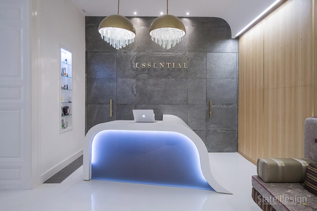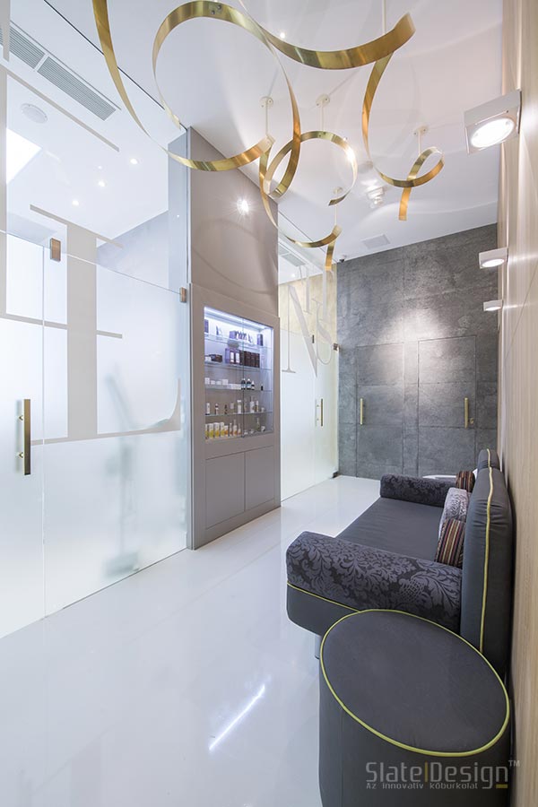 A szépség valóban alapvető az Essential Beauty Szépségszalonban. A budapesti belváros közepén található szalonban professzionálisan felkészült terapeuták és kozmetikusok exkluzív, harmonikus környezetben fogadják a szépítő- és testkezelések, arcápolás, valamin bio fogfehérítés iránt érdeklődő igényes vendégeket. A szépség az egész helyiség belsőépítészetével megbízott Habenczius Manna terveiben valóban testet öltött. Az ezüstös-zöldes csillogású Silver Shine csillámpala burkolatok két központi térben kaptak helyet. A látogató először a recepció rendkívül elegáns Corian pultja mögötti falfelületen, majd pedig a várakozótér egyik falszakaszán találkozhat az ultravékony palaburkolatokkal. Mindkét felületen nemcsak a falon, hanem a beépített tapétaajtókon is szinte töretlenül folytatódik a burkolat, ezáltal harmonikus egységet képezve.