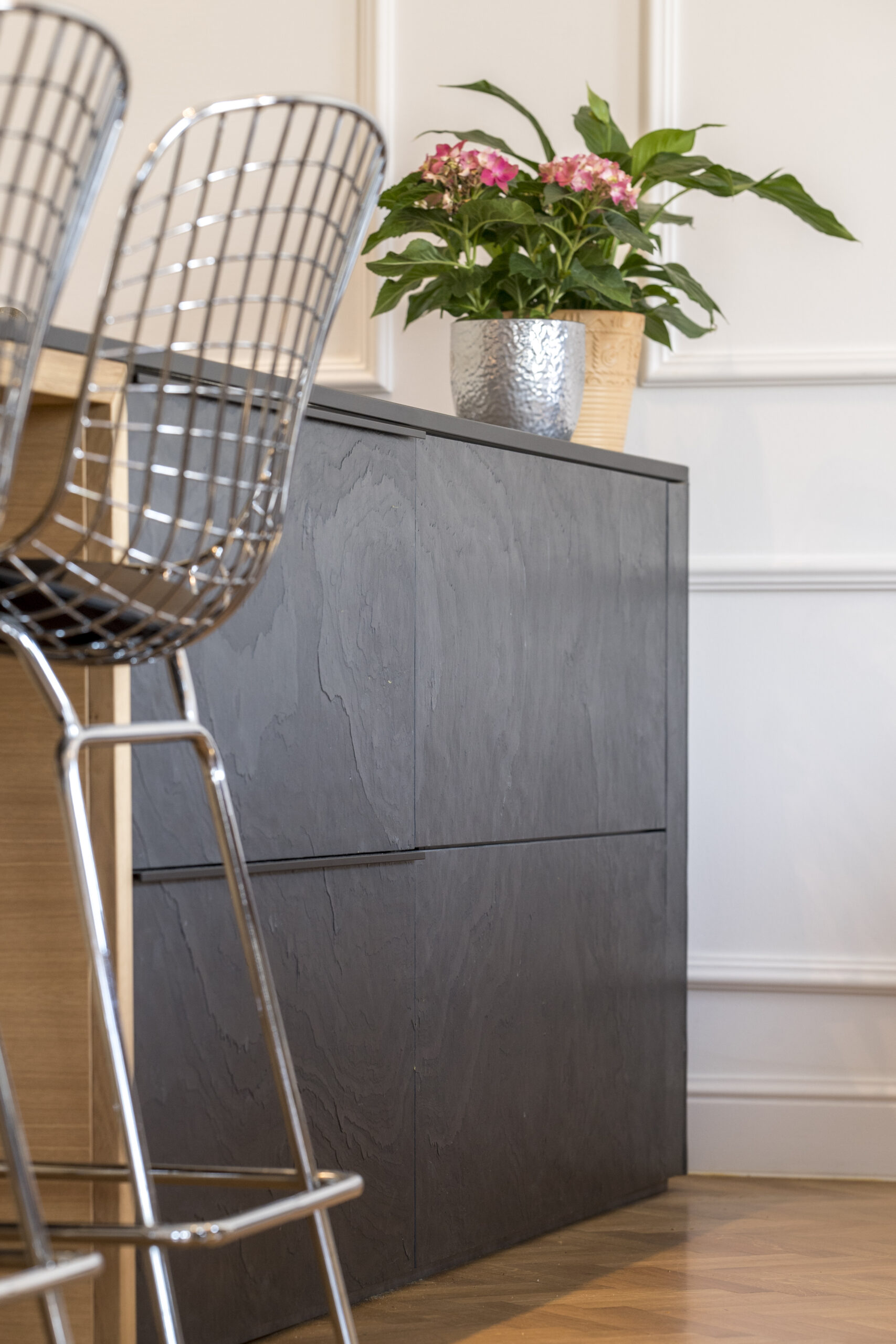 Az egyik ok, amiért Ügyfeleink nagyon szeretik ultravékony kőburkolatainkat, az a sokrétű felhasználás lehetősége. Egy budapesti lakás konyhaszigetére például Black LiteStone kőburkolatok kerültek. A mindössze 2 mm vastag kőfurnér lapok alkalmasak arra, hogy hőpréseléses technikával forgácslapra lamináljuk őket, s így természetes pala felületű komplett bútorfrontokat hozhatunk létre. A lapok SDA Stone Sealer Mat finish kőlakkal kezelték, ennek hatására színe mélyebbé és felülete könnyebben tisztíthatóvá vált.