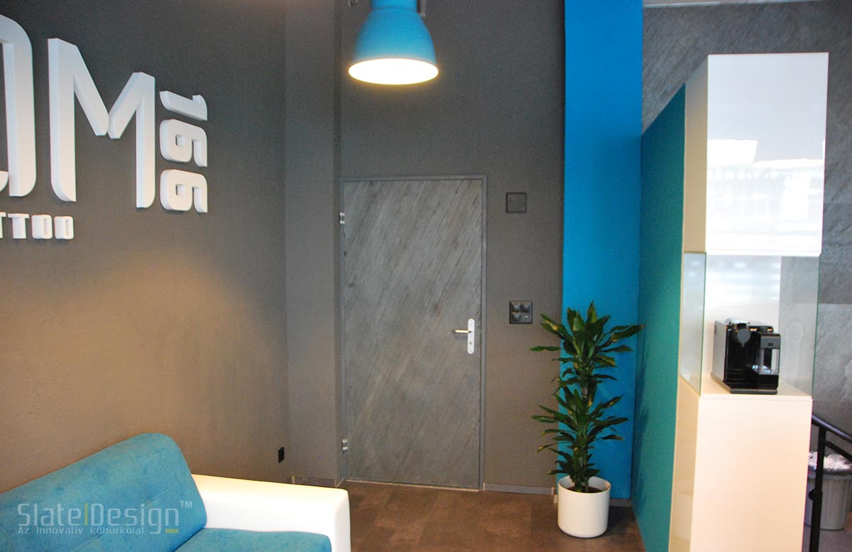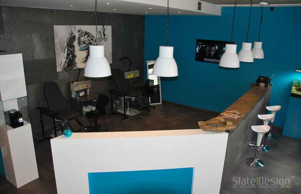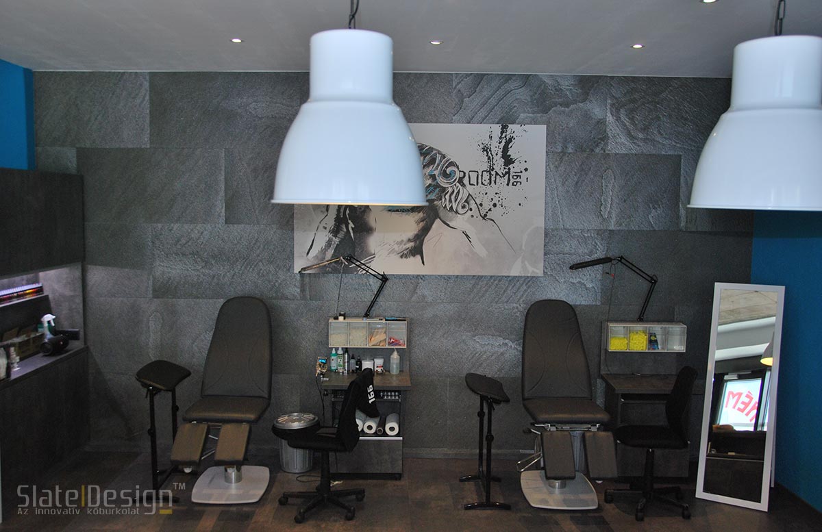 A svájci YourMindTattoo exkluzív tetováló szalonjának kialakításakor az arculathoz leginkább illő, maszkulin LiteStone Galaxy Black csillámpala lapokra esett a választás, melyek kiemelt helyet kaptak az üzlet központi háttérfalán és a bárpult oldalán. Ezen kívül a bejárati ajtó kapott egy D. Black csillámpala burkolatot egy extra, 244×122 cm-es tábla méretre szabásával.