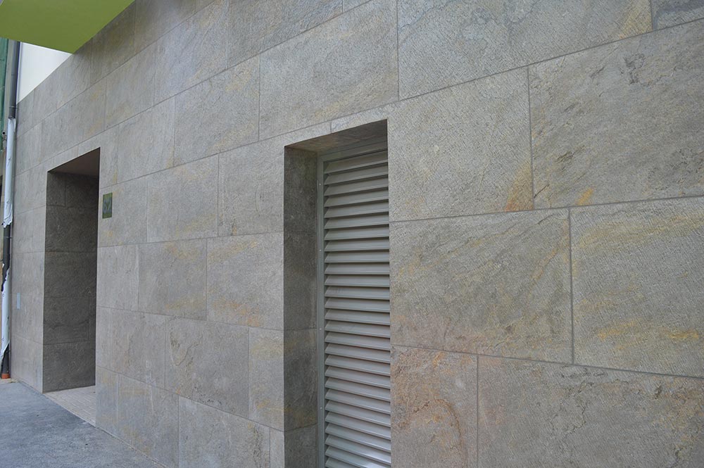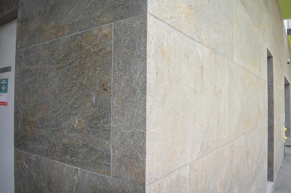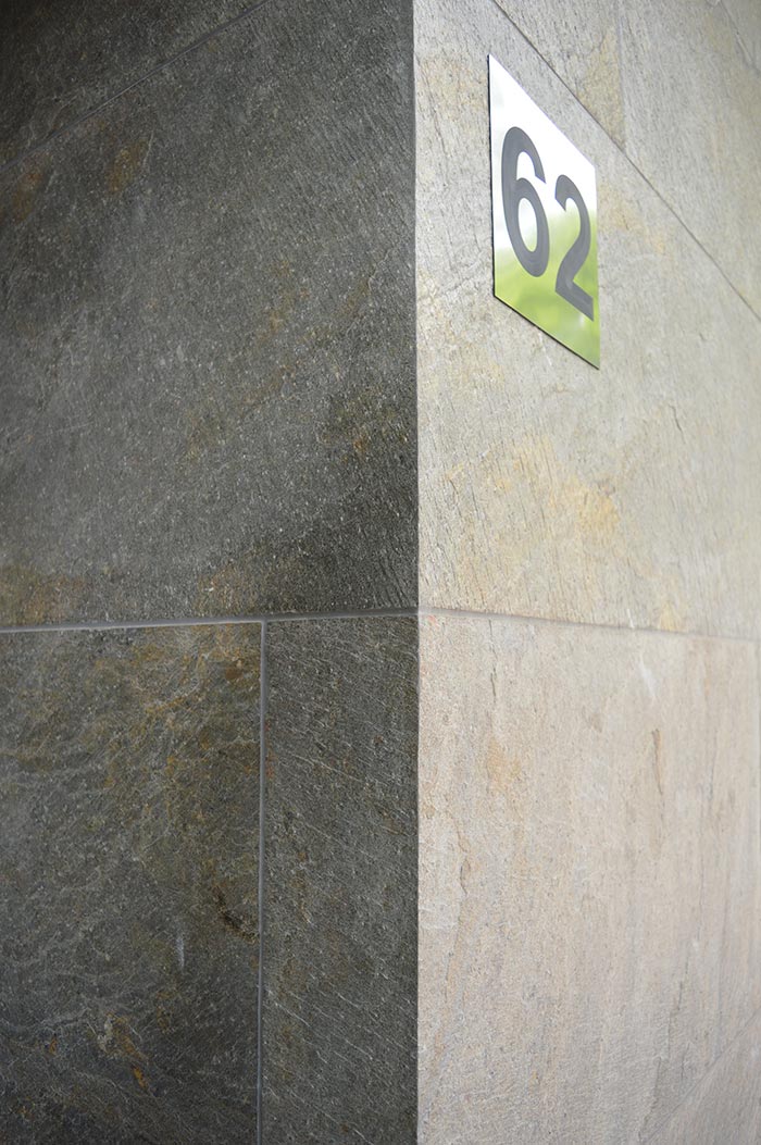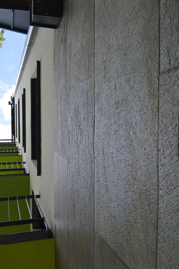 Az ultravékony LiteStone D.Green csillámpala homlokzatburkolatként is csodásan mutat. Budapest XIV. kerületében díszíti ez a kőfurnér az egyik társasház falát. A zöld, fehér, illetve szürke festéssel kiválóan harmonizál a palastruktúra árnyalata és tökéletesen illeszkedik a társasház modern stílusához. A képek jól szemléltetik, hogy a pozitív sarkok sem jelentenek problémát a Slate Design kőfurnér burkolatok számára.