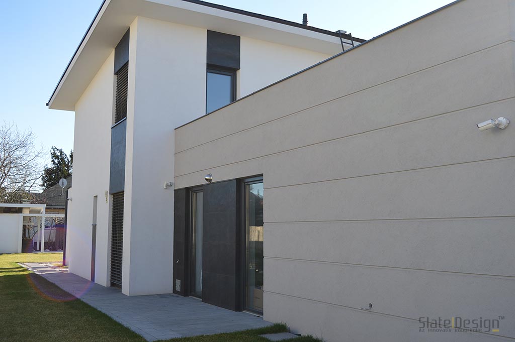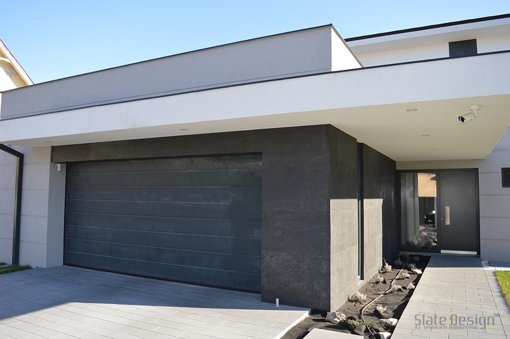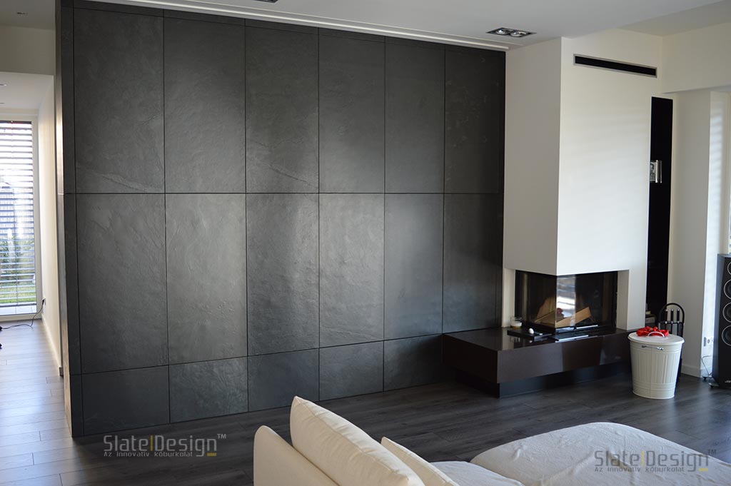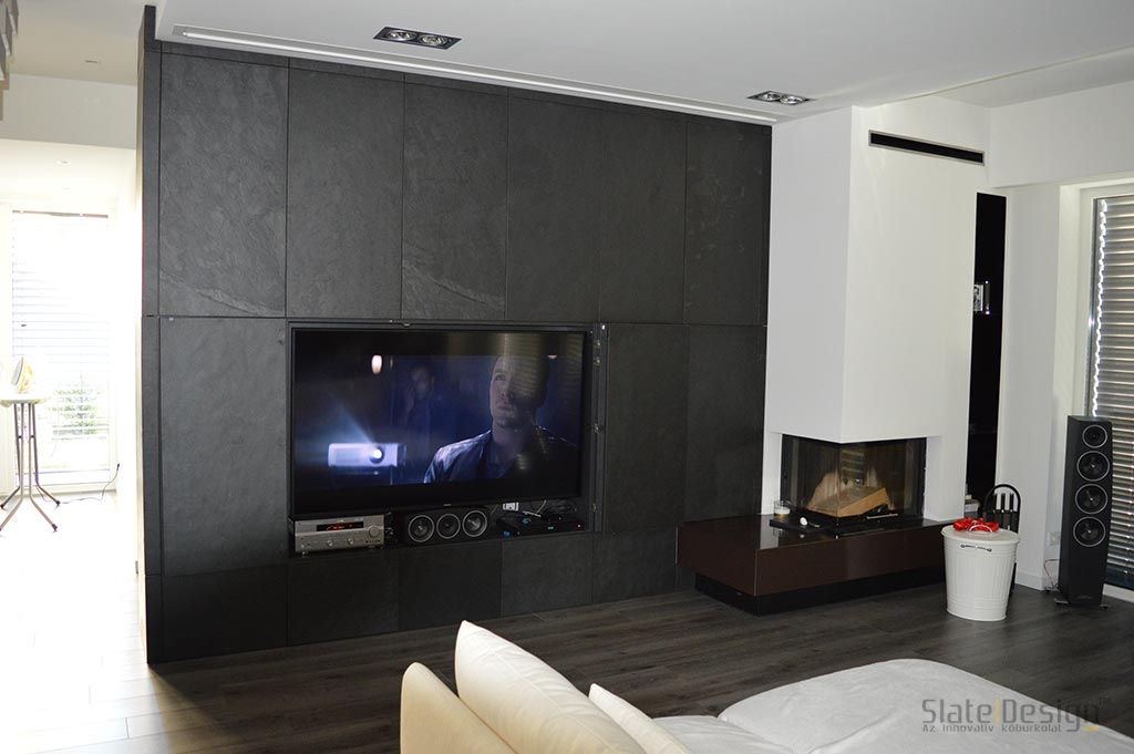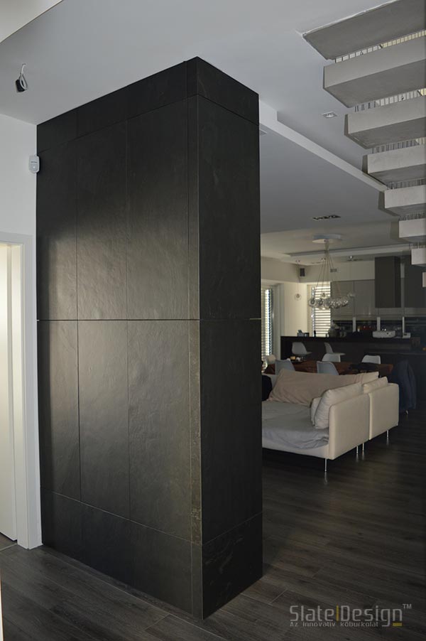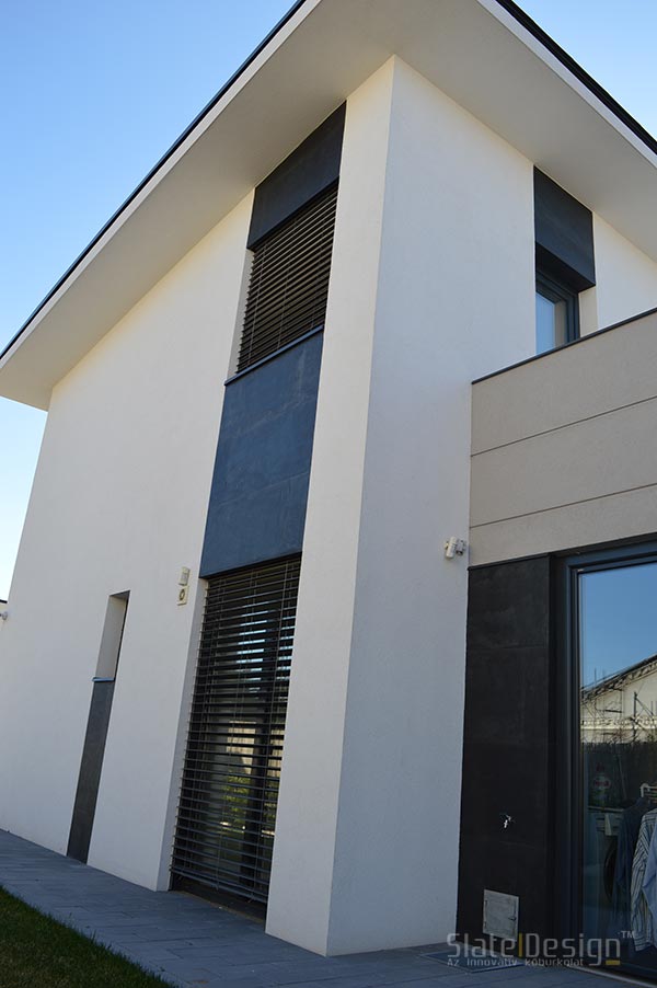 Ezen a modern XXII. kerületi családi házon Szabó Edit tervei alapján közel 100 m2-nyi LiteStone Black csillámpala kőfurnér burkolatot helyeztek el díszítőelemenként az épület több pontján. A fekete pala struktúrája rendkívüli módon harmonizál a manapság nagyon divatos antracit nyílászárókkal. A sallangmentes, profi kivitelezés egri burkoló partnerünk, Koczka Sándor és csapatának érdeme. A természetes palafelület megfelelő védelméről a Slate Design Stain Repellent Nano Effect impregnálószerünk gondoskodik. Az LiteStone Black palaburkolatokat a ház nappalijába is bekerült összhangban a fekete-fehér, minimalista dizájnnal. A profi asztalospartnerünk hőpréssel laminálta forgácslapra, és megfelelő felületvédelemmel látta el. Egy ügyes push-open mechanikának köszönhetően a média center egy szempillantás alatt elrejthető, és élvezhető a modern, letisztult, antracit kőburkolatos beépített szekrény látványa.