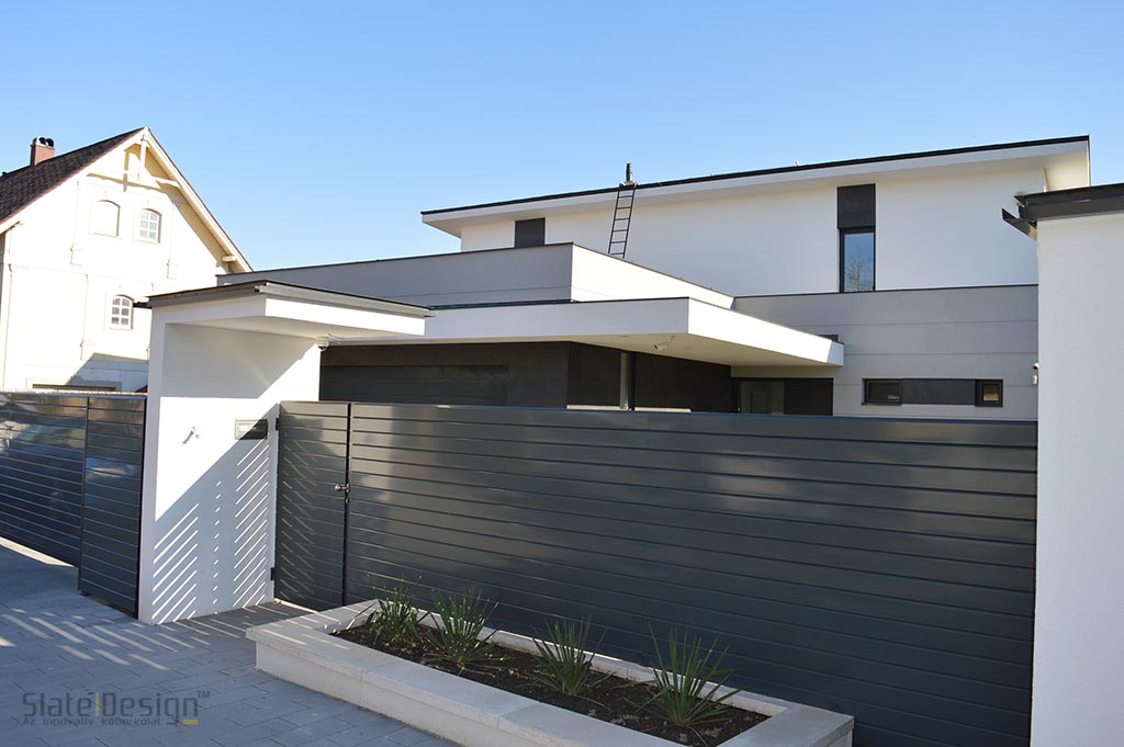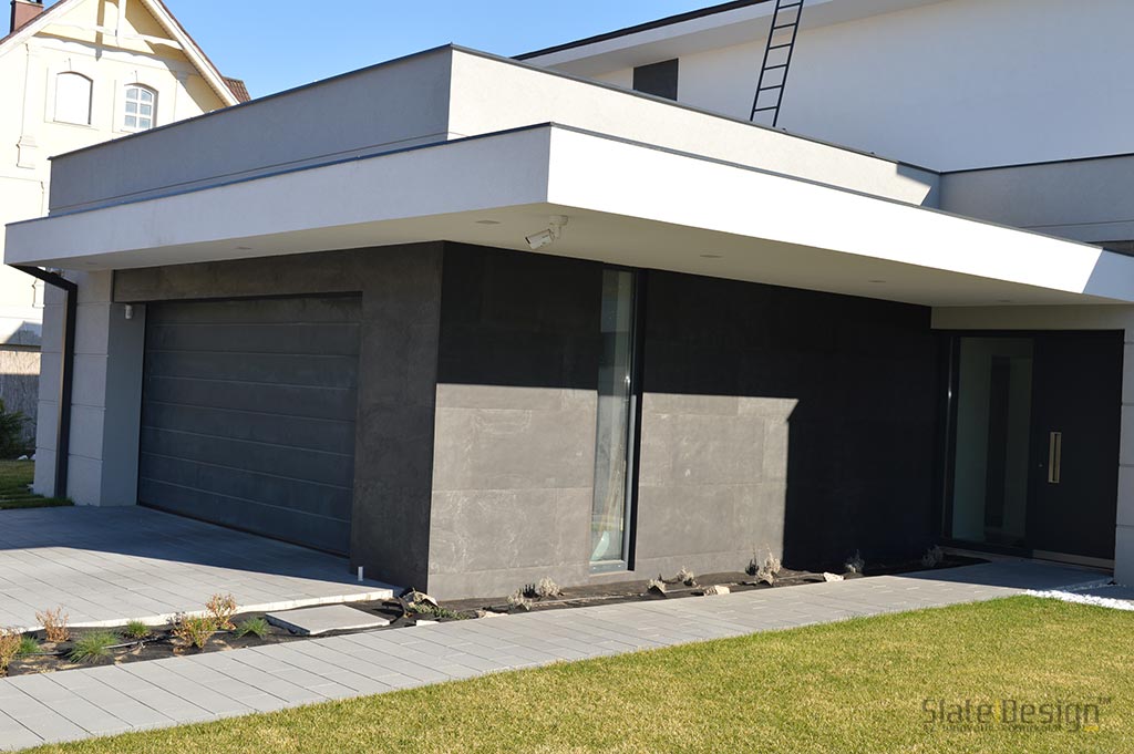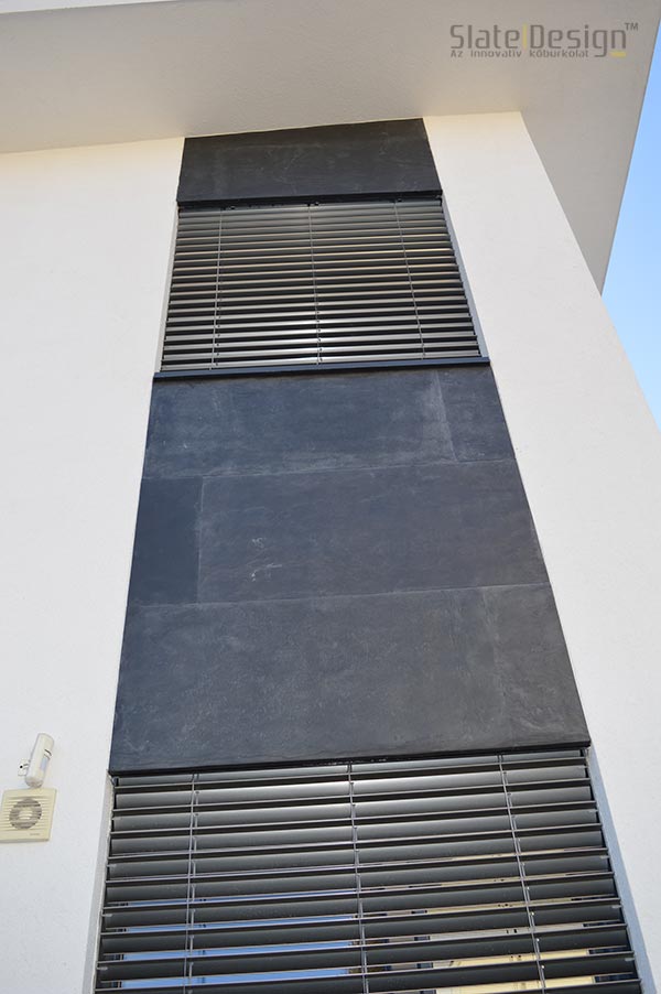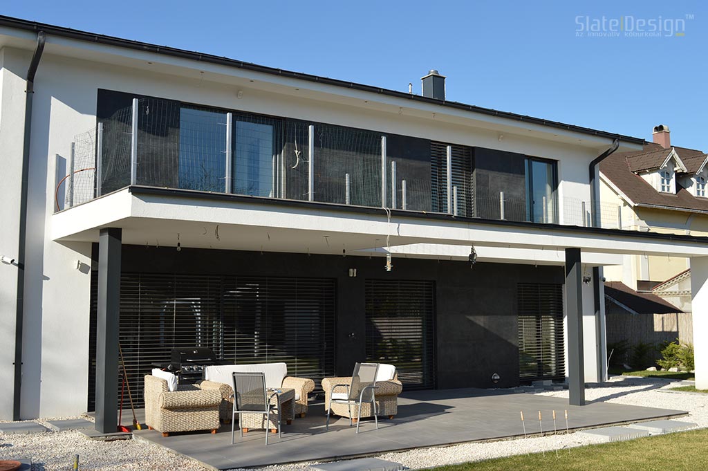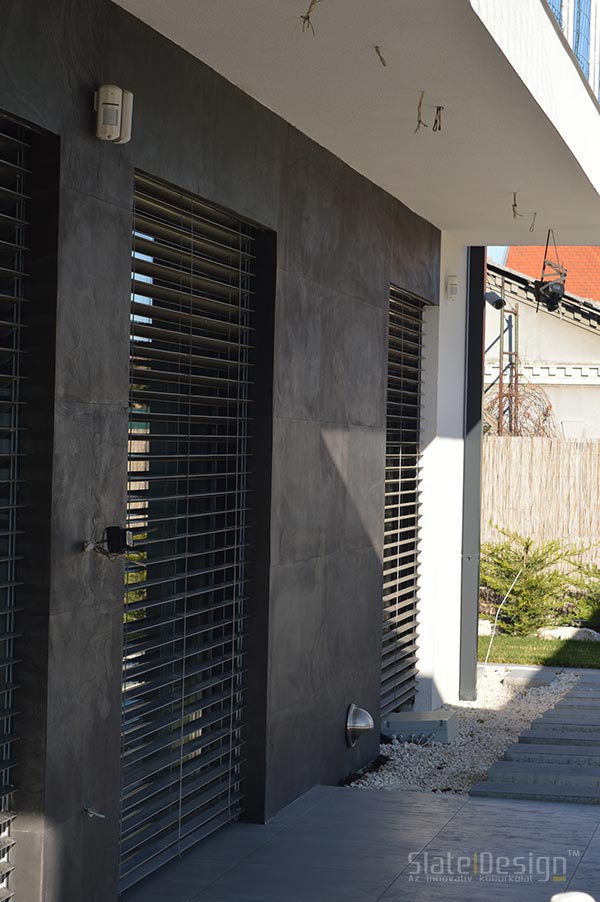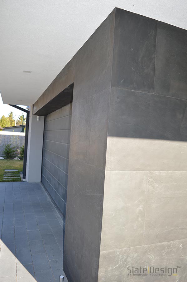Ezen a modern XXII. kerületi családi házon Szabó Edit tervei alapján közel 100 m2-nyi LiteStone Black csillámpala kőfurnér burkolatot helyeztek el díszítőelemenként az épület több pontján. A fekete pala struktúrája rendkívüli módon harmonizál a manapság nagyon divatos antracit nyílászárókkal. A sallangmentes, profi kivitelezés egri burkoló partnerünk, Koczka Sándor és csapatának érdeme. A természetes palafelület megfelelő védelméről a Slate Design Stain Repellent Nano Effect impregnálószerünk gondoskodik. Az LiteStone Black palaburkolatokat a ház nappalijába is bekerült összhangban a fekete-fehér, minimalista dizájnnal. A profi asztalospartnerünk hőpréssel laminálta forgácslapra, és megfelelő felületvédelemmel látta el. Egy ügyes push-open mechanikának köszönhetően a média center egy szempillantás alatt elrejthető, és élvezhető a modern, letisztult, antracit kőburkolatos beépített szekrény látványa.