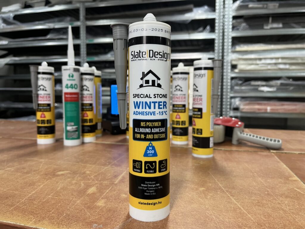 A Slate Design® kőfurnér homlokzatburkolat egyik legnagyobb előnye, hogy gyorsan, száraz technológiával szerelhető. A Slate Design® Winter és a szakszerű beépítés technológia segítségével ez már fagy közelében is biztonségosan is kivitelezhető. Az új innovatív ragasztó olyan biztonsági tartalékot ad, amivel a télen fűtött sátrak vagy ideiglenes melegítés mellet sem kell aggódni amiatt, hogy a ragasztó kötése leállhat.